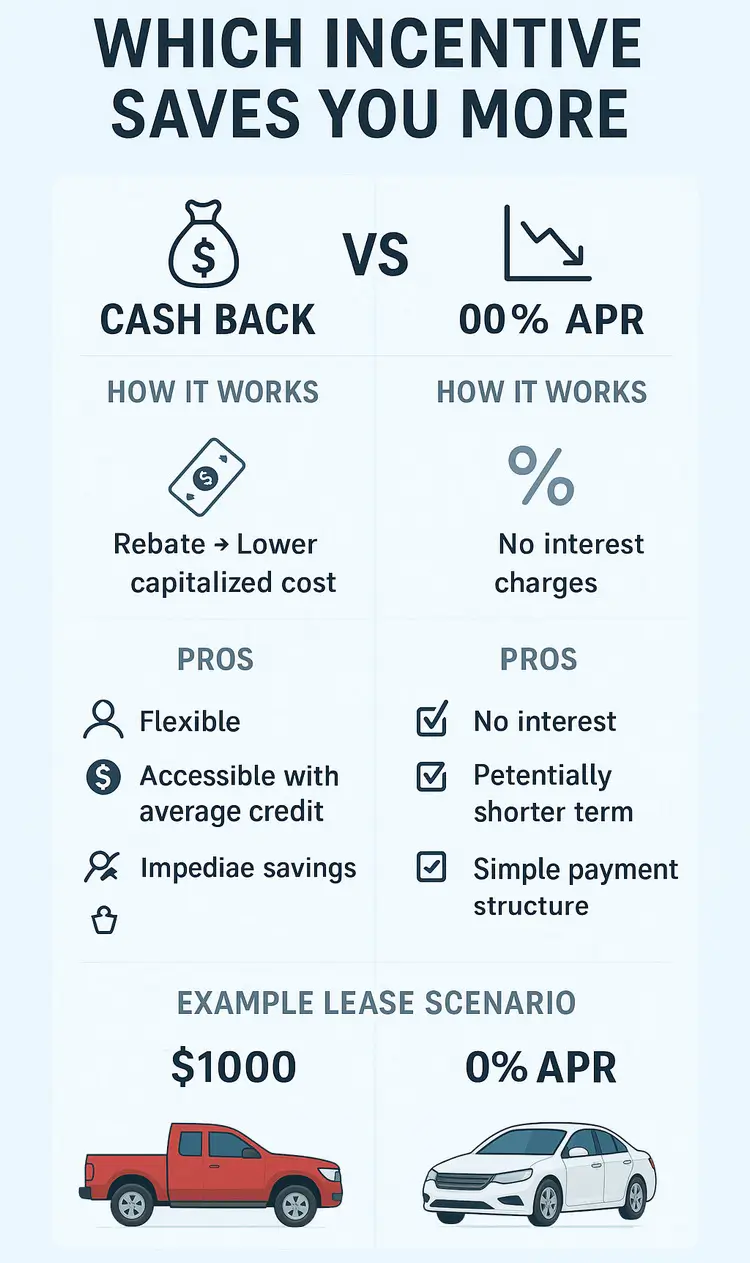 - However, keep in mind: 0% APR deals are often limited to shorter terms (24–36 months). While they reduce total cost, the shorter lease period can result in higher monthly payments compared to a longer lease with a rebate.